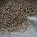 Über den Filterkuchen gießt man nun noch das restliche Wasser von 78 °C, den Nachguss, um das Malz weiter auszuwaschen. Die Malzreste (Trester) kann man zum Brotbacken verwenden, verfüttern oder kompostieren.