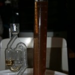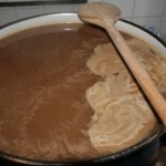 Nun kann man die Stammwürze überprüfen, die bei mir zu diesem Zeitpunkt ca. 12 °P betrug. Die Würze wird jetzt zusammen mit dem Hopfen 90 Minuten gekocht. Nach dem Kochen muss die Würze auf ca. 20 – 25 °C abkühlen. Die Stammwürze stieg durch das Kochen (Wasserverlust) auf ca. 13 °P, die Würzemenge betrug insgesamt ca. 19 Liter, wovon ich zwei Liter heiß abgefüllt (steril) in Flaschen zurückbehalten habe. Bei dieser Stammwürze müsste ich ziemlich genau 0,10 €/Liter Biersteuer entrichten, also für den gesamten Sud 1,90 €. Ich wage stark zu bezweifeln, daß das in einem sinnvollen Verhältnis zum Verwaltungsaufwand liegt.